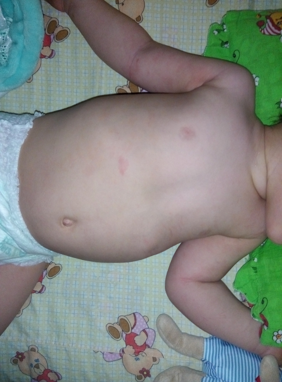День 4й. Воскресенье. В больницу не поехали, кожа была чистая, немного следы остались и всё. Темп 37-37.4. После обеда появились единичные пятнышки, к вечеру ещё несколько, опять замечаю, что если ударился или дотронулись, остаётся след. Фото перед сном и ночью. Перевернув ночью на спинку, на животике следы похоже от надавливания на кожу.