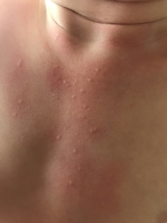 Высыпания на кожеАллергическая? Вчера и сегодня начали принимать новое лекарство, гомеопатические таблетки, плюс ринофлуимуцил второй день.