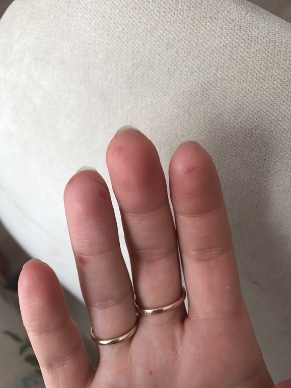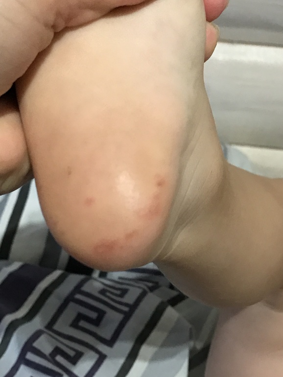 Темп больше не поднималась. Пока летели, чесал пятки, не предала значение, думала от камушков, когда ходил по ним. Дома через пару дней вырвало его, поехали к нашему педиатру, посмотрела послушала, говорит вирус, пейте антибиотик , горло левита. Забыла ей показать пятки его. В ту ночь у меня была темп 38, а к вечеру появилось на пальце руки красное пятнышко! На сл день ещё одно и ещё и ещё)) болезненные, как будто занозы. Пишу врачу, отсылаю фотку - говорит коксаки! Ну капееец( вот как так то? У нас видимо в лёгкой форме, никаких водянистых прыщей нет, в мелкого на ступнях, у меня на ладошках пальцах и ступнях. Но они у нас просто красные, плоские. Это оно? Кто уже переболел этим вирусом нехорошим, было так? И у меня ещё новые появляются я смотрю! Первые высыпания появились в чт! Сначала мало, сегодня побольше. У мелкого я тоже заметила сначала пятки, потом появились на пальчиках. Ходить ещё больно как будто жжёт ! На фотках пятка мелкого, рука моя)))