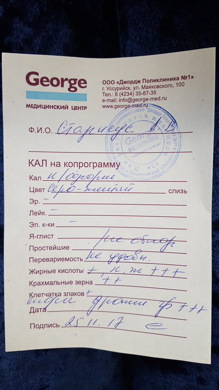 н/оформл - не оформлен, глисты и простейшие не обнаружены, жирных кислот много (+++ - это дофига, буквы не знаю =)), много спор дрожжевых грибов. Вообще же понятный почерк =)