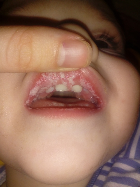 Лечим горло, язык, губы...Девочки,помогите пожалуйста,заколебалась бегать по этим недоврачам,которые диагноз поставить не могут.Утром в 4 часа ребёнка вырвало несколько раз водой,которую он пил ночью,температуры,поноса ничего нет и не было.Утром в 9 часов пошла в платную клинику к педиатра,хирургу и сделали УЗИ брюшной полости. В результате сказали что ничего страшного,похоже начинается ОРЗ.На УЗИ немного увеличена печень.Так вот,этот придурок педиатр полчаса с фонариком смотрела горло и рот ребёнка,я предупредила,что утром обнаружила на внутренней стороне губ несколько белых пятен,на что мне ответили,что может быть обжег немного рвотными массами.А сейчас у ребёнка весь рот белый,вообще не понимаю что делать.Может это стоматит,посмотрите пожалуйста.