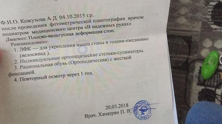 Прописали гимнастику (велосипед), ортопедические стельки с супинатором и ортопедическую обувь с жестким задником. И через полгода повторить обследование.