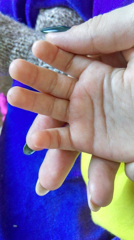 Ребенок правша. Гуляем регулярно,но недолго. Чаще магазин-площадка-дом. Заметила эти высыпания две недели назад,после тоно как побыли несколько дней в гостях у родителей. Сначала просто заметила мелкую сыпь,как крупа на мизинце,потом сильнее и сильнее пошла она по тыльной стороне ладоней,преимущественно на правой. Наощупь как "гусиная кожа" или мурашки. А потом внутри ладони и в основном кончики пальцев стали шершавые,как при экземе. Не знаю на что думать. Аллергия на какой-то продукт? Но тогда почему одна рука?А если это контакт с чем-то,то я убрала давно все,ни пластилин,ни краски,ни песок не даю.