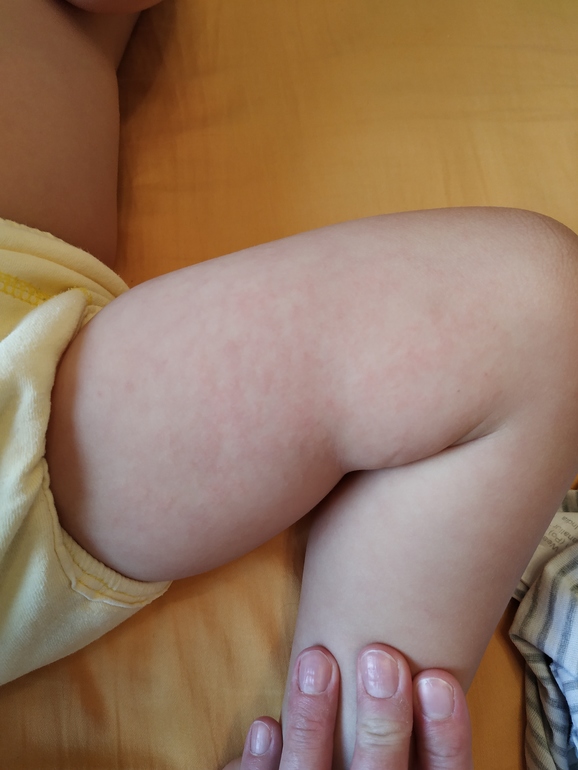 АллергияУже с неделю. На внутренней поверхности бедра красная, на животе немного бесцветная. Это пищевое? Ребенку 2.10. Чем мазать? Ребенка не беспокоит, не чешет.