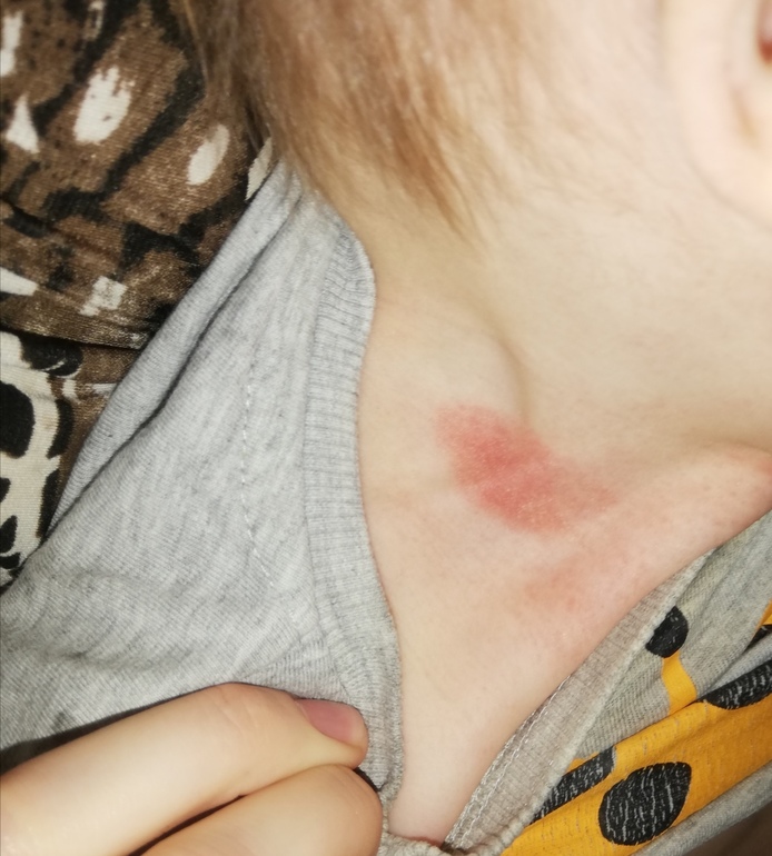 АллергияВсем привет! Девченки спасайте. Второй ребёнок, малышу год и 2 месяца, такое вижу первый раз. Пятно на шее красное не проходит неделю, боюсь в интернете искать, ещё на животе появились пятна, дня два как. Неужели пищевая аллергия?? Ничего такого не ест, супи, каши, овощи, творожки и кефиры. Может на молочку? Дала антигистаминное. Завтра к педиатру пойду. Как думаете что это?