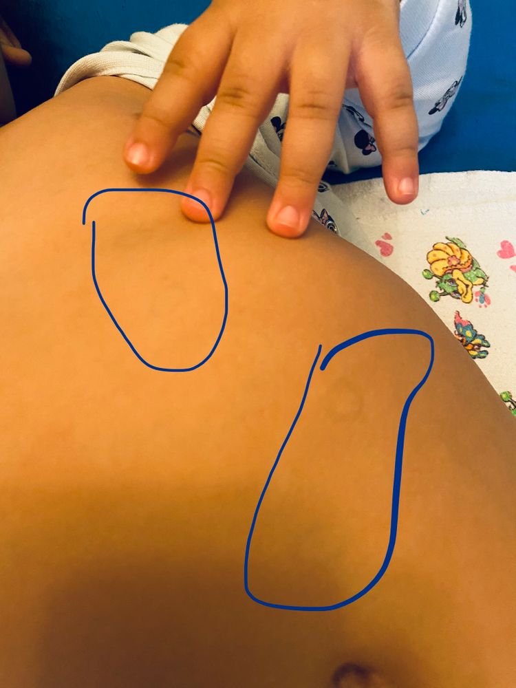 Высыпания на кожеРебёнку 2,10. Ни на что не жалуемся. Утром заметила такие вот кругляшки на животике и груди. Похожи на капилляры, под кожей немного синеватые. Не беспокоят, кожа чистая, не красная. 4 штуки. Что это может быть? Фото внизу наше ⁉️