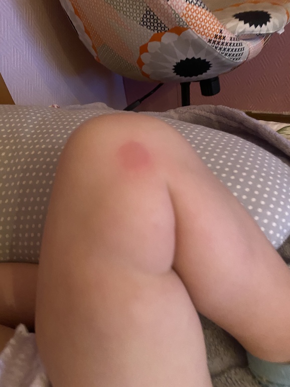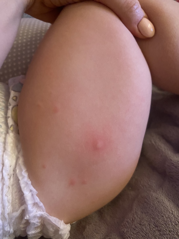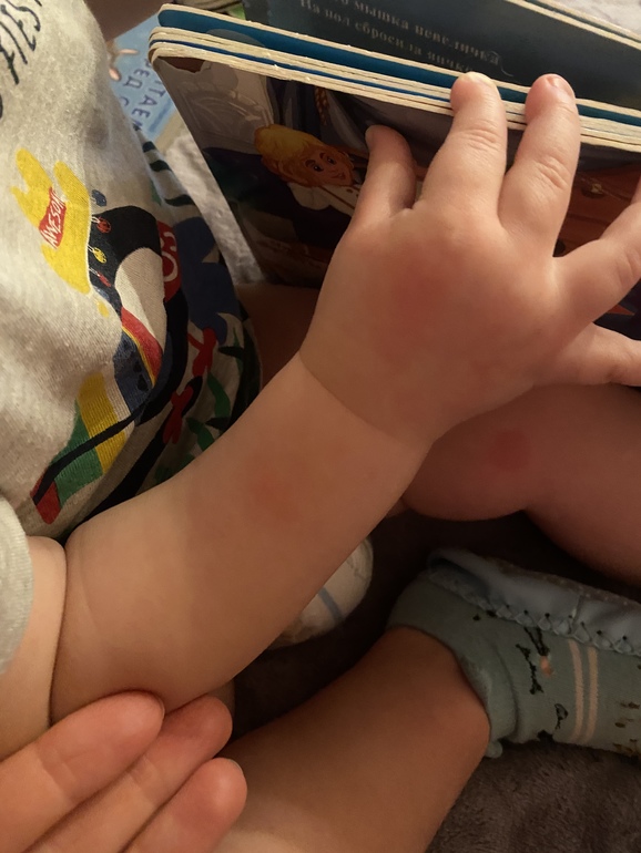 Высыпания на кожеПосмотрите пожалуйста!!! Высыпало за секунду ребёнка, на ляжках в одинаковых местах, на коленке вообще какое то пятно большое. На руках просто какие то красные пятна. Похоже на укусы, но кусать некому. Это похоже на ветрянку? Аллергия? Температуры нет, состояние обычное