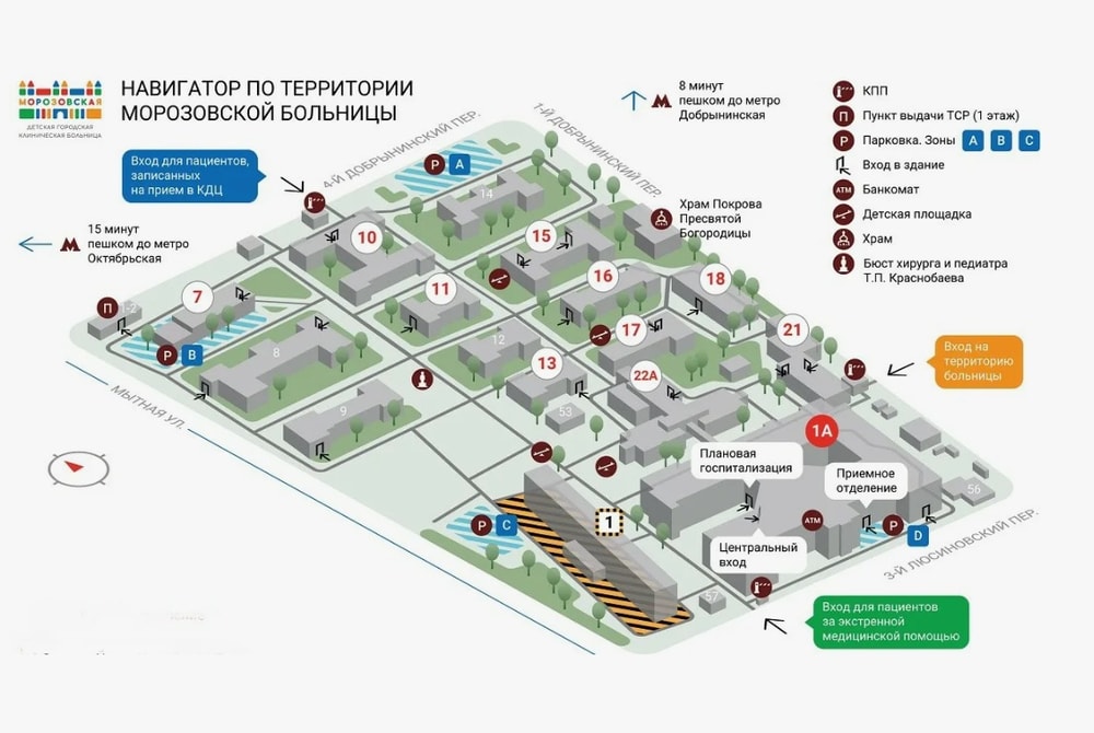 Записаны на прием в Морозовскую больницу, платно, корпус 1. Пытаюсь понять, где вход в корпус 1, чтоб минимально идти пешком по территории больницы с маленьким ребенком.