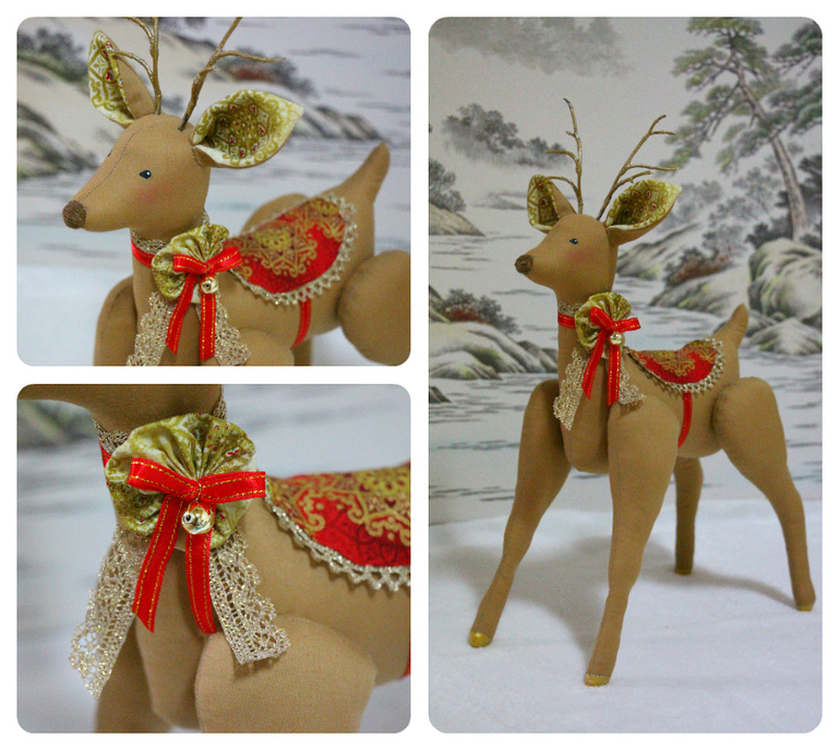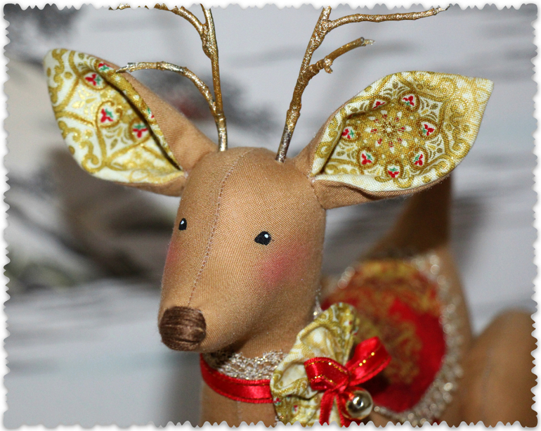 Давно уже планировала сшить этого милого рождественского оленя по тильда выкройке. И тут быстро, за 2 дня он появился. В сказке у оленя серебряное копытце, а у меня олешка в золотой гамме с золотыми) Можно бы было пятнышки нарисовать, но мне почему-то захотелось надеть седло...хотя возить он никого не собирается :)
