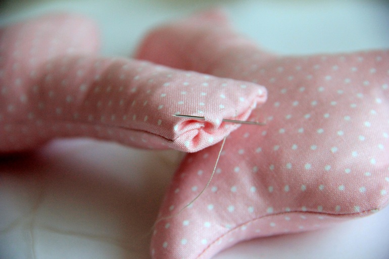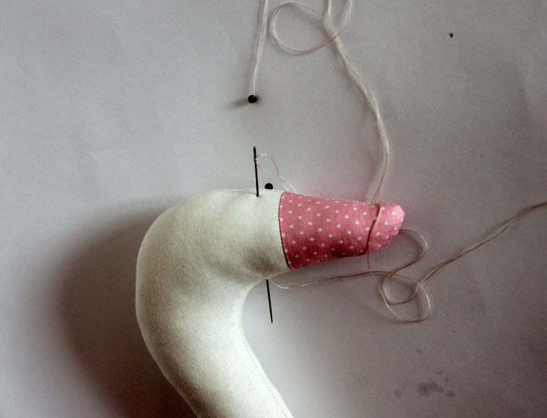 Складываем их попарно, клюв к голове, лицом друг к другу. Фиксируем булавками, делаем строчку.