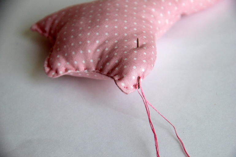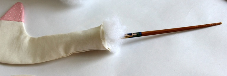 Набиваем - берем небольшой кусочек холлофайбера, скатываем его в шарик, запихиваем пальцами в тушку и проталкиваем тупым концом палочки для суши.