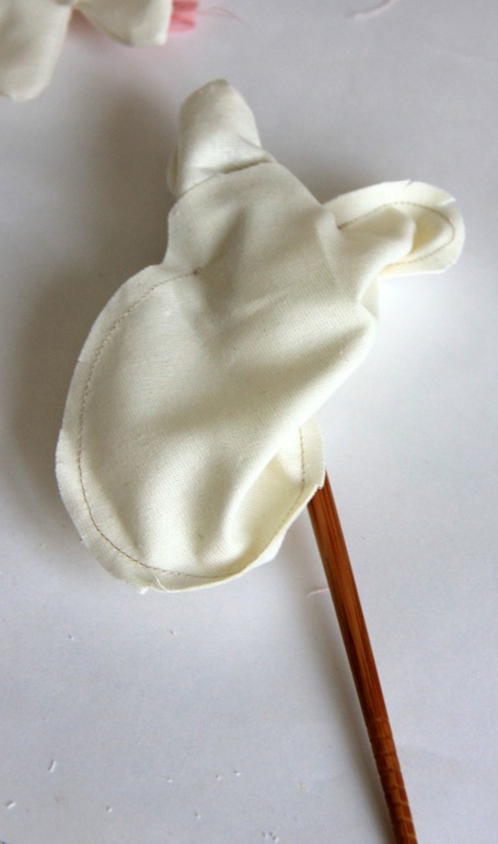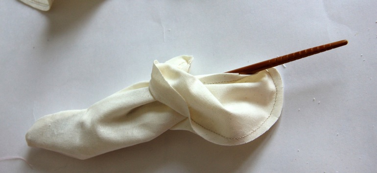 Тут я перевернула палочку тупым концом вперед, чтобы не порвать ткань. Вывернули - расправляем той же палочкой, можно острым концом.