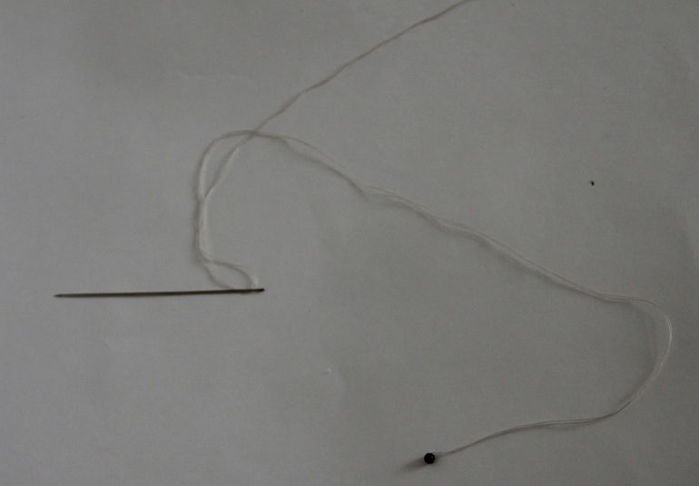Теперь осталось пришить глазки. Я хочу немного утянуть их, чтобы мордочка была выразительнее. Продеваю нитку в бусину, оба конца нити продеваю в иголку: