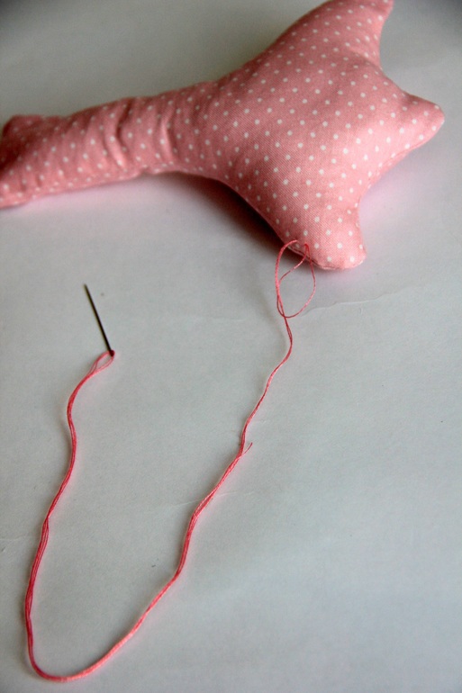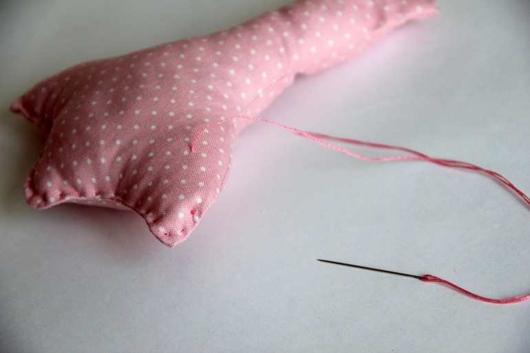 В конце со стороны пятки завязываем аккуратный узелок, конец нитки прячем вглубь лапы, вытягиваем; надо чуть потянуть ниточку и обрезать вплотную к ткани, чтобы ничего не торчало.