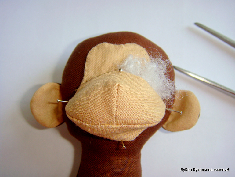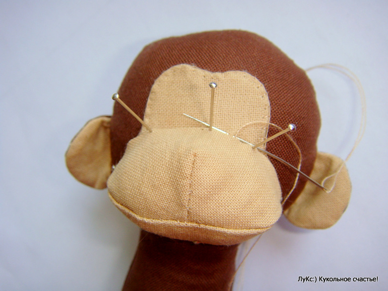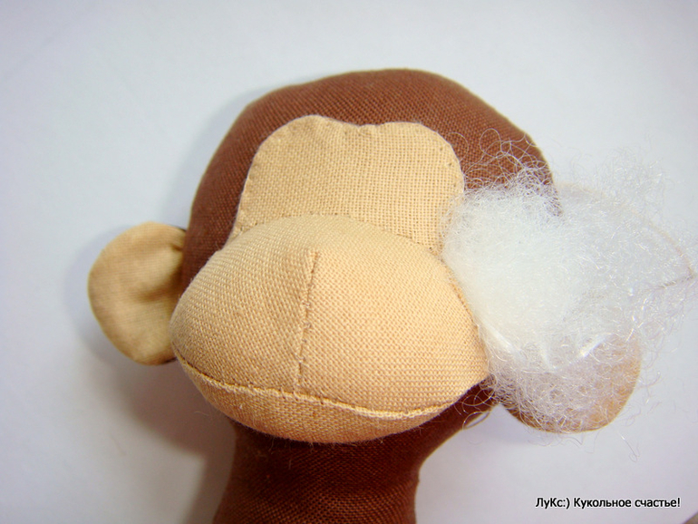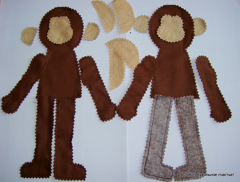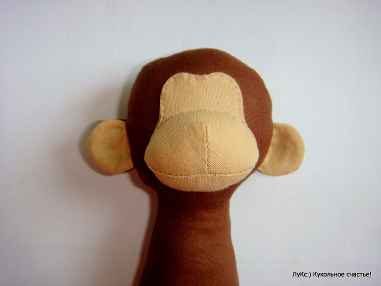 Переводим выкройку на ткани для тела и лица (расчет на одну обезьянку): коричневая ткань - туловище - 2 дет, ручки - 4 дет, ножки - 4 дет, ухо - 2 дет; телесная ткань - ухо 2 дет, лицо - 2 дет, верхняя и нижняя часть мордочки по 1 детали. Прострачиваем нитками в тон, оставляя незашитыми низ туловища, верх ножек, отверстие сбоку на руках, низ ушек. Лицо прострачиваем полностью по кругу.