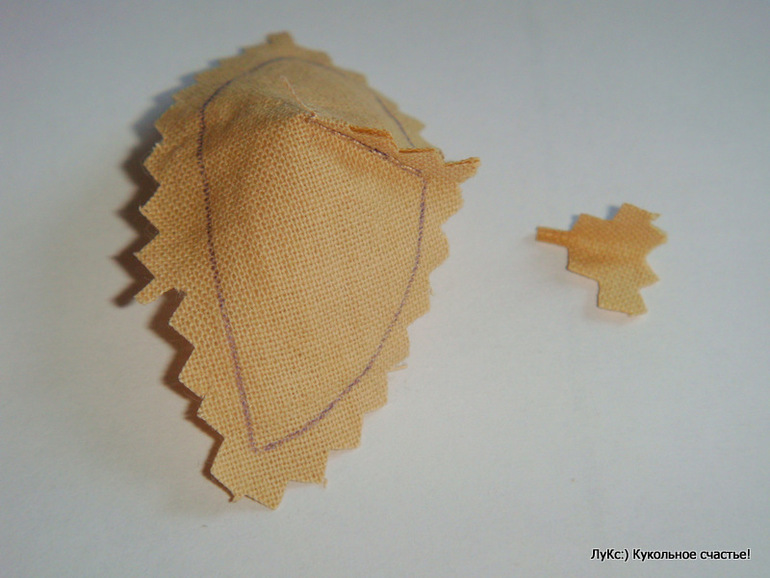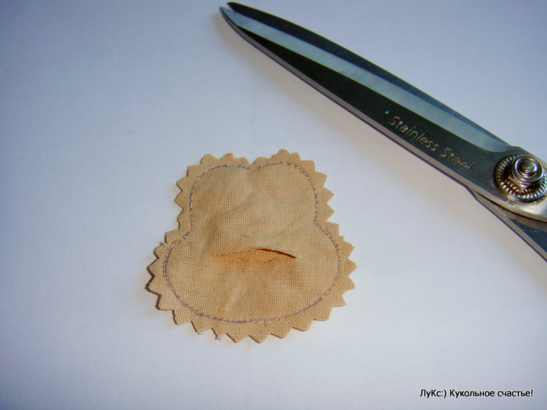 Вырезаем (у меня ножницы зиг-заг для удобства), надсекаем все впуклые и выпуклые места), собираем - проверяем наличие всех деталей. В этом месте отступление.. Я сначала прошила голову, и потом мне пришлось подпороть с боков шов, чтобы вставить ушки и снова прошить. Вы можете не повторять мой маневр, а сначала прошить ушки, вывернуть их, вложить внутрь головы (срезы наружу!)и прошить все вместе.