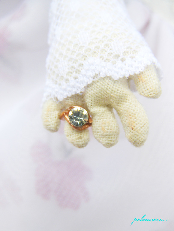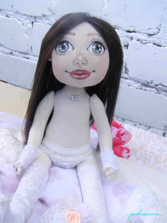 Текстильные куклы (кроме вальдорфских)Невеста нежная...милая...трогательная.. Первую её головушку пришлось забраковать..по выражению личика...и делать заново)). Сшита из индийского не беленного хлопка. Наряд весь легко снимается и состоит из: обувки ручной работы, кружевных чулок, подвязки, нижнего белья, нижней юбки, платья с декольте и многослойной юбкой, трёхслойной фаты и митенок. Очень нежное, пышное платье...акцент в образе сделан на розы. Украшения и цветы в веночке и букете невесты ручной работы. Пальчики все сгибаются и могут держать лёгкие предметы. Личико расписано акрилом по ткани, маслом и пастелью. Волосы крепко пришиты, можно создавать прически). Сидит и стоит самостоятельно. Ростик около 32см. Сшита малышка для свадебного салона).