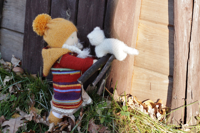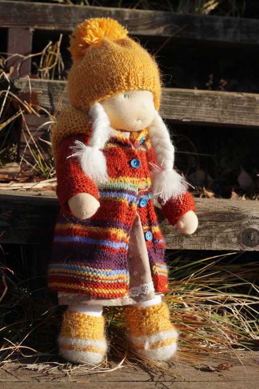 Куколка сшита полностью из натуральных материалов по традиционной вальдорфской технологии из хлопкового трикотажа, набивка - овечья шерсть, для волос используется шерстяная пряжа. Волосы вшиты-вышиты равномерно по всей голове, их можно расчесывать и делать разные прически. Ручки и ножки двигаются свободно, естественно. Гардероб - платье, панталончики, колготки, ботиночки, пальто с капюшоном, шапочка - вся одежка легко и свободно снимается.