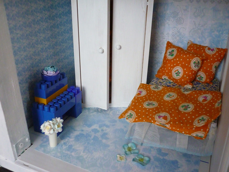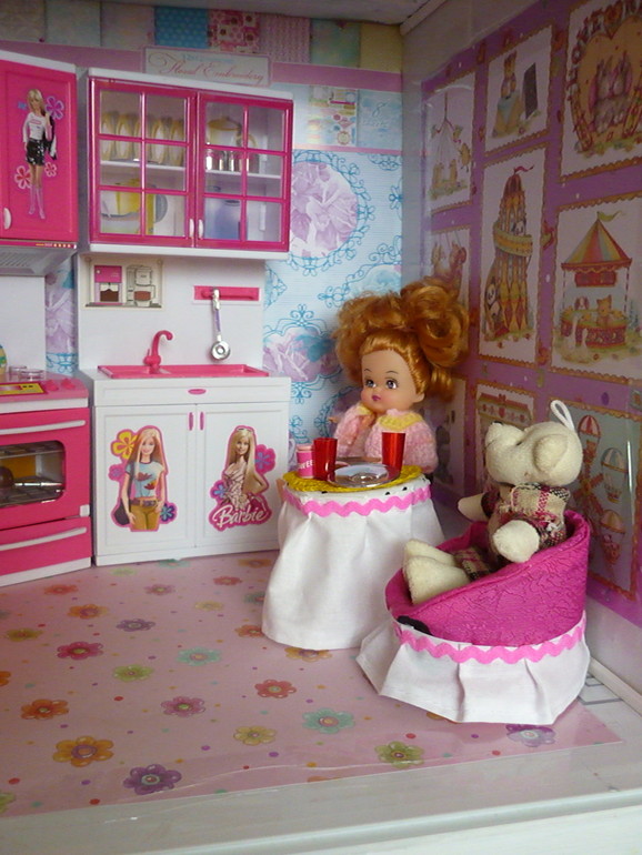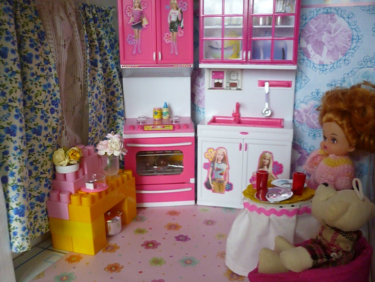 Дом состоит из 4 комнат плюс мансарда. Куня пока мне нравится больше всего, т.к. она самая додуманная из все комнат. Поклеили обои, повесили шторы, временно сделали камин из конструктора. Из пластиковых бутылок сделала столик и два кресла. Духовка работает. Посуды мало, да и пока хватит, а то очень надоедает собирать по вечерам мне эту мелочь