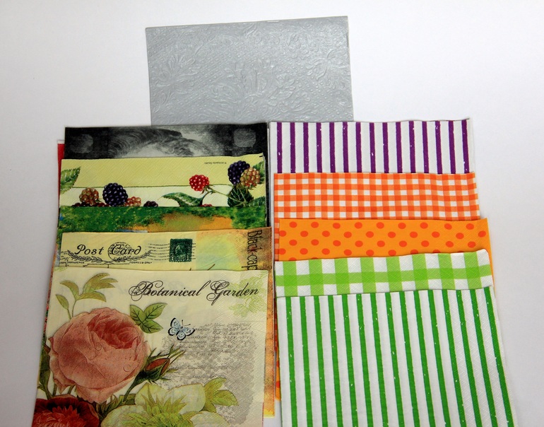 Еще много салфеточек для декупажа, интересных расцветок, серебряная фактурная-рельефная вдобавок.
