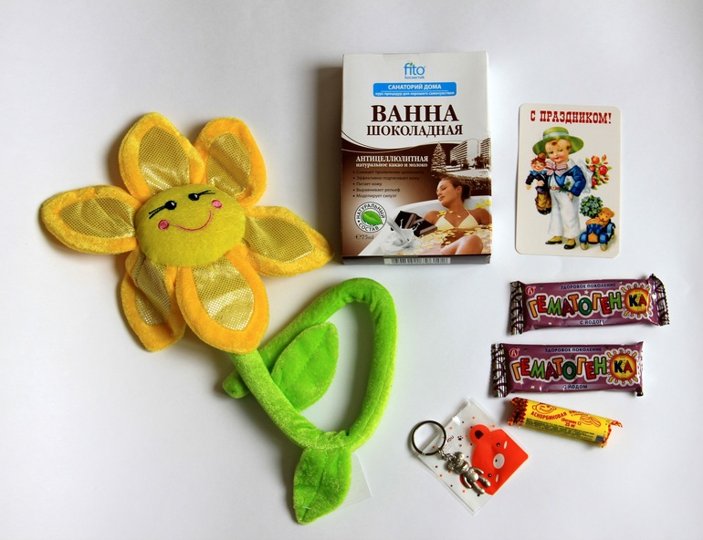 Сверху предусмотрительно лежали подарки для детей: цветок Никита сразу забрал себе. Для ванны мне, конечно)) Брелок Наде.