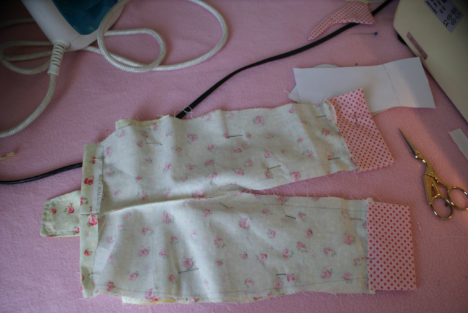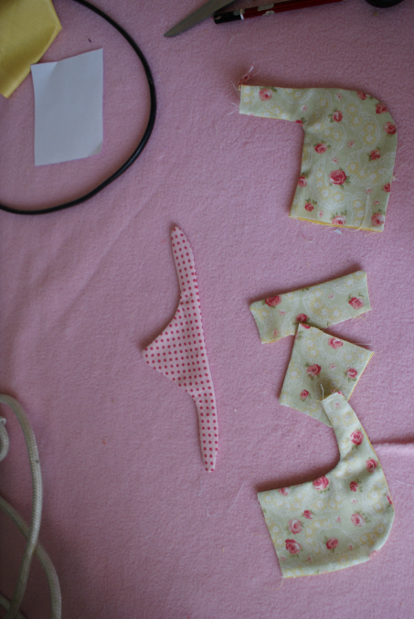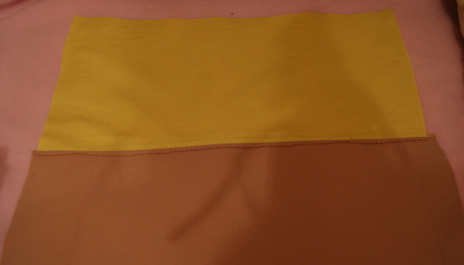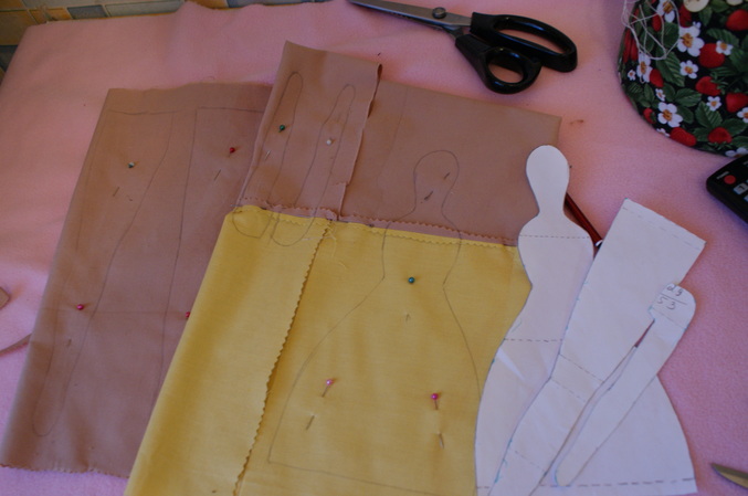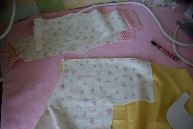 Выкроила остальные детали: карманы, косынку, нагрудник и аля-пояс ( как я уже писала, ткани не хватало, поэтому я в качестве внутренней ткани взяла другую, ту самую желтую)). Если кто то будет делать так же, то обратите внимание, что кроить нужно в зеркальном отображении. Я как то не подумала сразу и пришлось шить еще один (уже правильный) карман