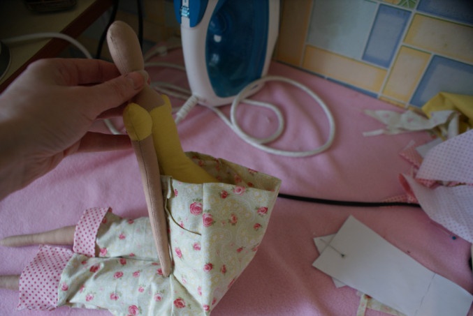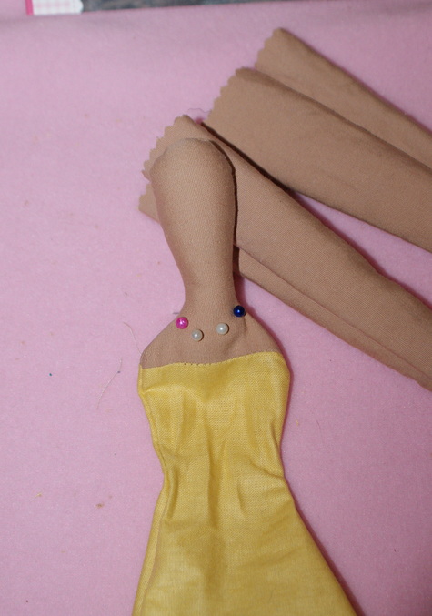 В этот раз я очень одолго мучилась с шеей, даже так... я вообще впервые так мучилась с шеей. Связываю это с тканью, шью кукол из нее впервые. Ну в общем на 10й раз набивания и опустошения шеи, я решила сделать как на фото. т.е очень плотно набила, закрепила иголками, чтобы вниз не сползало и продолжила набивать. Только после этого у меня вышла нормальная шея)