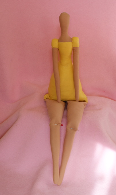Пришиваем руки и ноги. Я сначала прикалываю ноги и смотрю, чтобы самостоятельно сидела, как только урегулирую так что сидит-пришиваю потайным швом. Руки тоже прикалываю булавками и пришиваю потайным швом. Я только только закончила)))