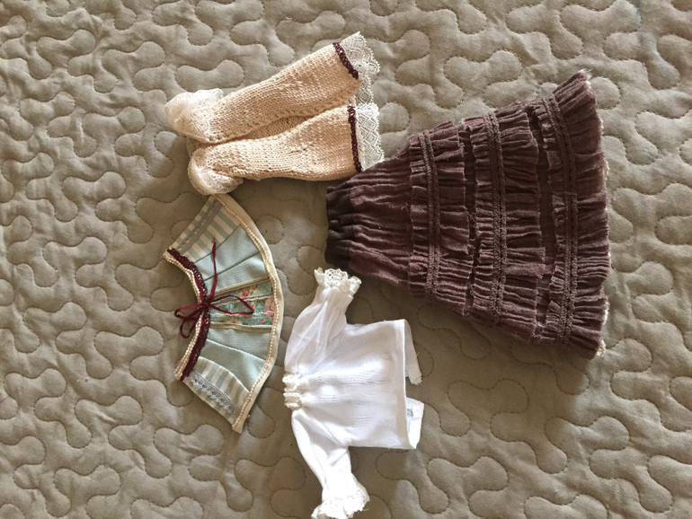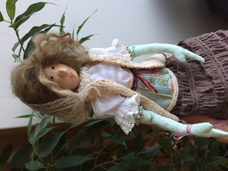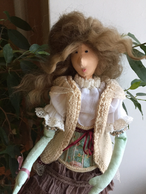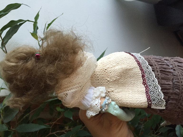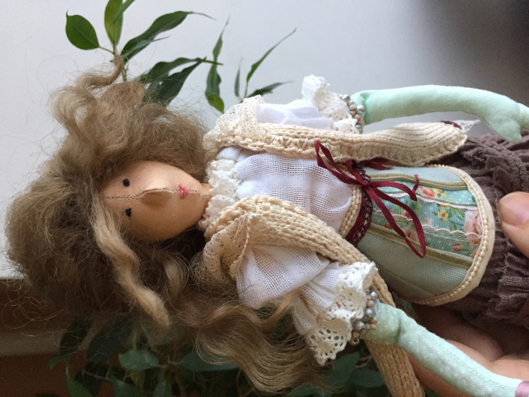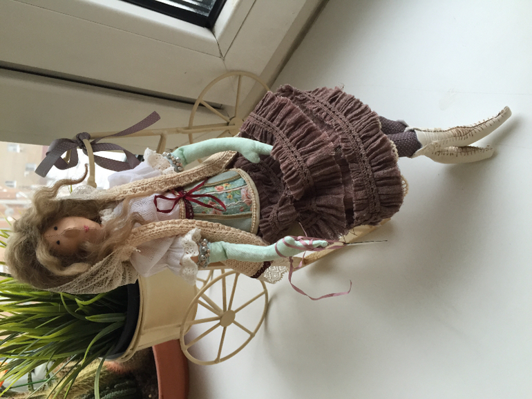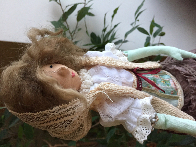 Мне очень понравилось работать с юбкой. Материал типа марлевки. Даже не резать, а рвать- эффект понравился. Опять же - повторила вышитые губки и выдающийся нос. Эта куколка и Элизабетт были экспериментальными моделями - носатыми. Но эти носы как раз очень живо подчеркивают их характеры))).