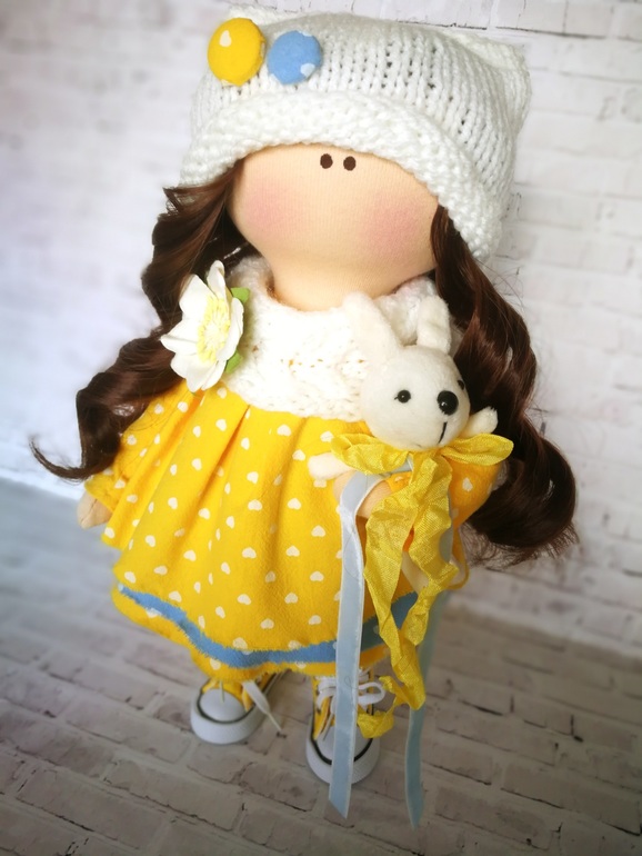 Солнечная малышка с зайкой сшита для благотворительной лотереи, которая проходит в инстаграме на моей страничке @dolls_and_scrap. Девочка получилась не такая уж и маленькая - 33 см:) Трехслойное платьице, панталончики, шапочка с ушками.