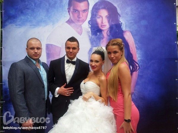 Смешно, конечно, фоткаться на фоне своей фотографии, и не знаю я зачем ей это фигня на голове, как-то плохо она подобрала всё, и мейк и прическу... Ну, а так счастья молодым!