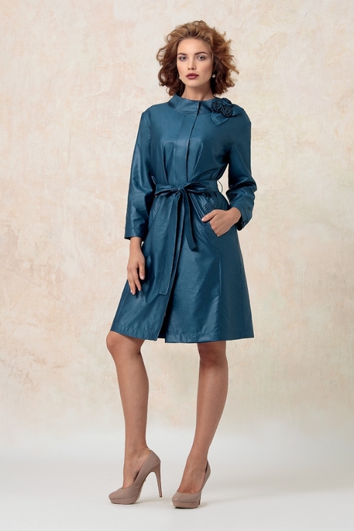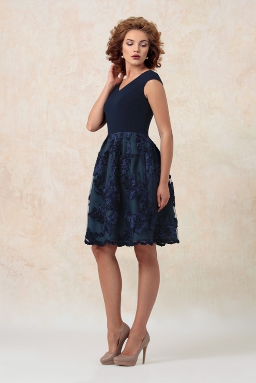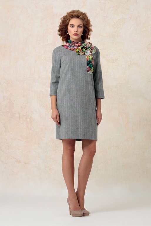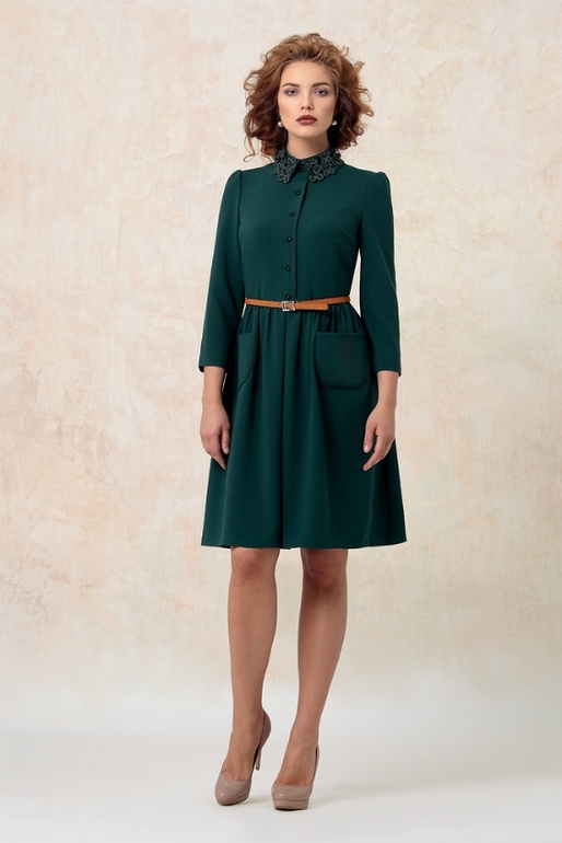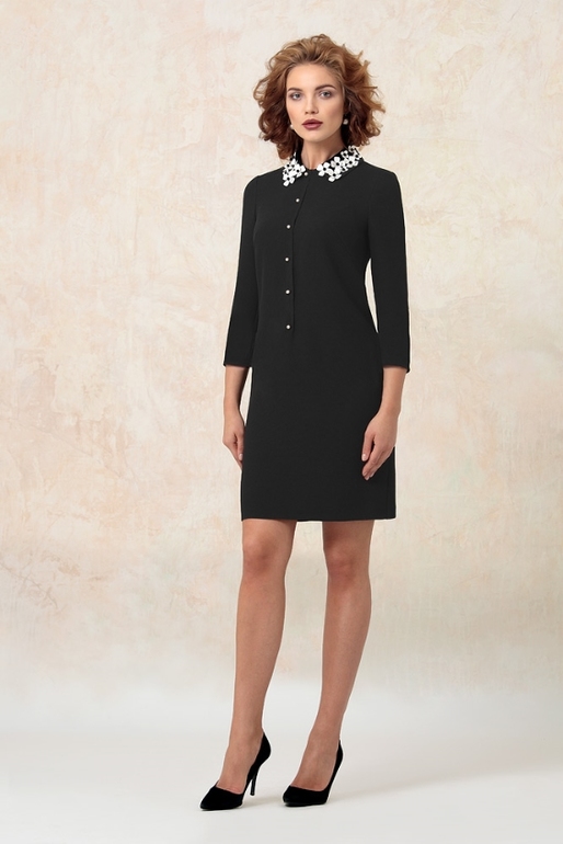Деловое платье полуприлегающего силуэта, выполнено из немецкой ткани со стрейчем с рельефным переплетением нитей. Воротник декорирован цветочками из кожи, вырезанными лазерным методом и украшен многогранными бусинами. По переду расположена планка, которая застёгивается на пуговицы. Рукав 3/4 , длина выше колена.