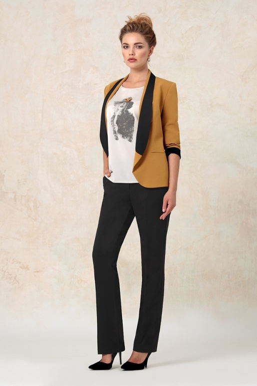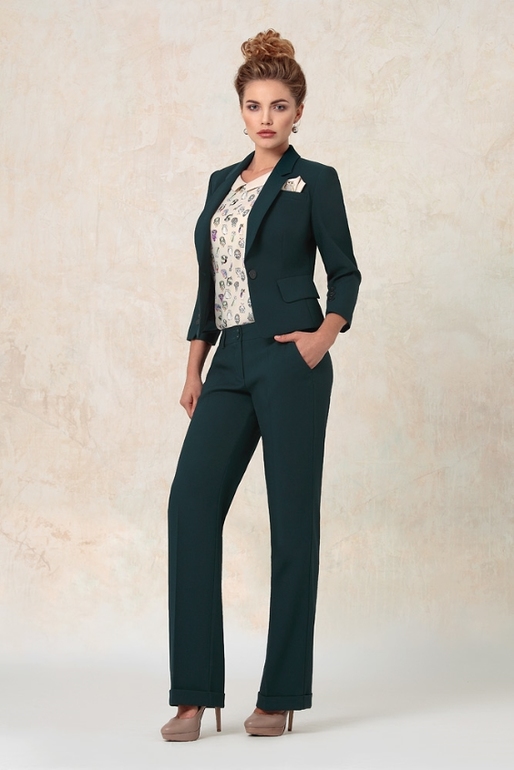 Жакет выполнен из поливискозной стрейчевой ткани, приталенного силуэта. Однобортный жакет на подкладке, по переду застёгивается на две пуговицы. Рукав длинный. Воротник с отворотами по лацкану. По переду расположены накладные листочки. Классические брюки из поливискозной стрейчевой ткани. Средняя посадка, силуэт прямой, облегающие по бёдрам, слегка заужены к низу. Брюки на притачном поясе, со шлёвками для ремня. Боковые карманы.*****************************************************************************************