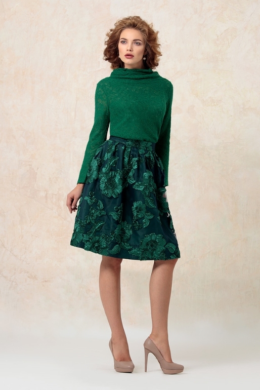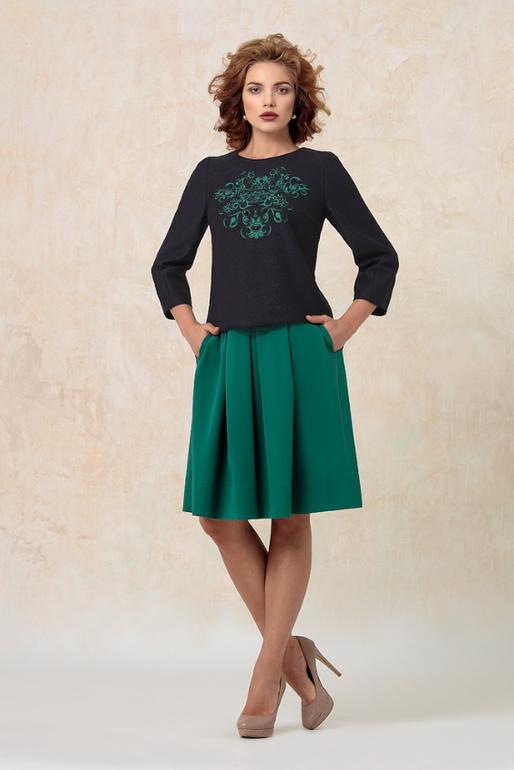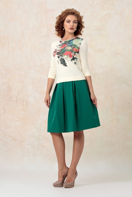 Привлекательный джемпер полуприлегающего силуэта, выполнен из итальянского трикотажа с люрексом. Горловина округлая, рукав 3/4. По переду расположена цветная авторская печать. Собранные в букет цветы -главный акцент в модели. Юбка из поливискозной ткани, со складками прекрасно держить форму и подчёркивает женственность. Стильные карманы расположены в боковых швах. Юбка на приточном поясе. Без подкладки.![]()