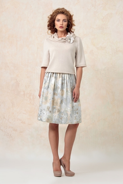 Эксклюзивный свитшот из итальянского трикотажа с люрексом. Хомут мягко обрамляет горловину и придаёт нежность образу. Рукав укороченный. Дополнением служит цветок авторской работы художника.Прямая юбка из ткани парча. Юбка сияет серебряными нитями и белёным золотом. Юбка на притачном поясе.![]()