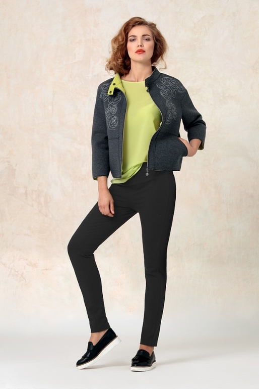 Куртка в спортивном стиле из гладкого двустороннего трикотажного неопрена. Длинный втачной двухшовный рукав. Вышивка стежками, имитирующая розы, молния по переду, воротник стойка на кнопках. Блузка из ткани шифон. Свободного прямого силуэта. Короткий рукав на спущенной пройме. Горловина округлая. Облегающие брюки из трикотажной стрейчевой ткани в спортивном стиле, на резинке.![]()