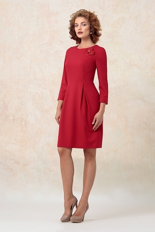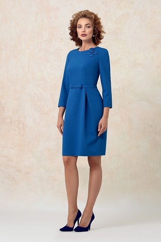 Платье А-образного силуэта, выполнено из поливискозной стрейчевой ткани. Рукав ¾, втачной. Застёжка на потайную молнию, расположена по спинке. Декорировано платье элементом в виде банта из основной ткани. Бант украшен стразами. Длина выше колена.![]()