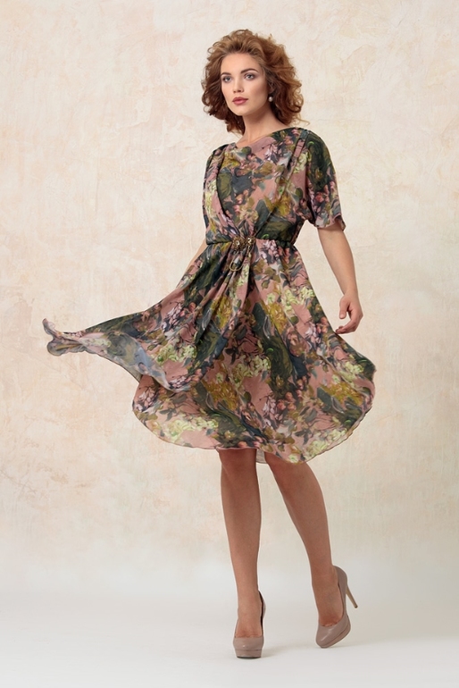 Привлекатальное платье из мягкой поливискозной ткани, рукав укороченный. Горловина с имитацией блузки, которая выполнена из принтованного шифона, изящная съёмная брошь служит дополнение. По переду вставки из клиньев.![]()