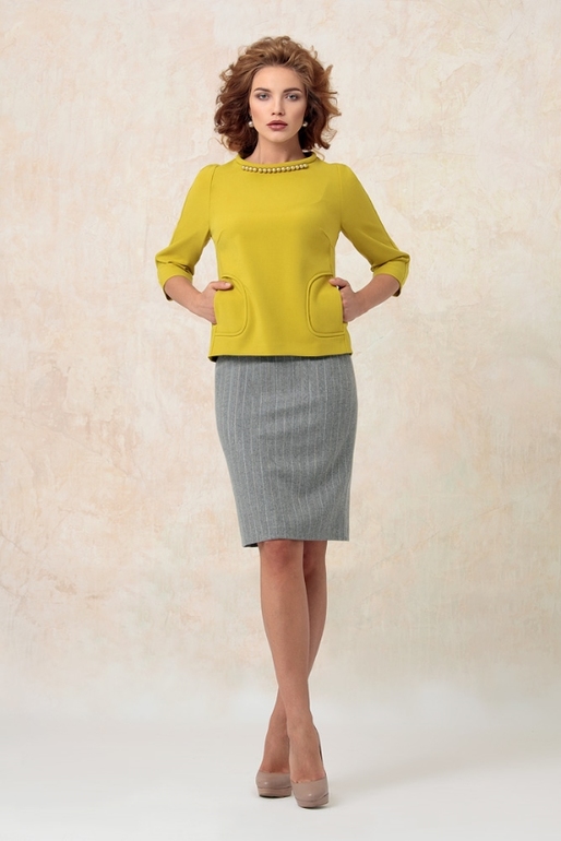 Стильная женская блузка, выполнена из нежной креповой ткани. Блузка отрезная по линии талии со складкой по переду. Съёмный цветок ручной работы на жемчужных бусах служит изыканным украшением Рукав длинный втачной, с отложными манжетами. Юбка прямая из поливискозной ткани. Юбка на подкладке, застегивается сзади на потайную молнии.![]()