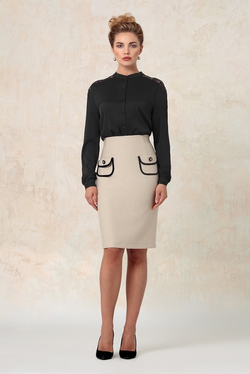 Классическая, строгая блузка.Выполнена из тонкой блузочной ткани.Воротник-стойка, украшен пришивными бусинами, рукав на манжете. Юбка прямая, сзади слегка удлинённая. Привлекательные складки в виде веера, привлекают внимание.![]()