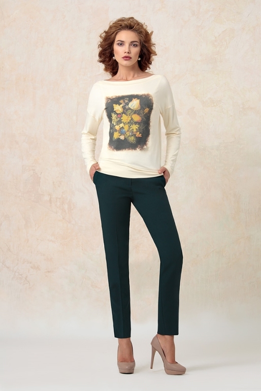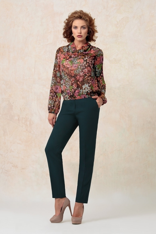 Вискозная блузка мягкого непринуждённого силуета. Принтом служит итальянская цветочная живопись. Вырез-лодочка выгодно подчёркивает вписанный в квадрат рисунок.Женские классические брюки. Выполнены из мягкой поливискозной ткани. Брюки с боковыми карманами и на притачном поясе со шлёвками.