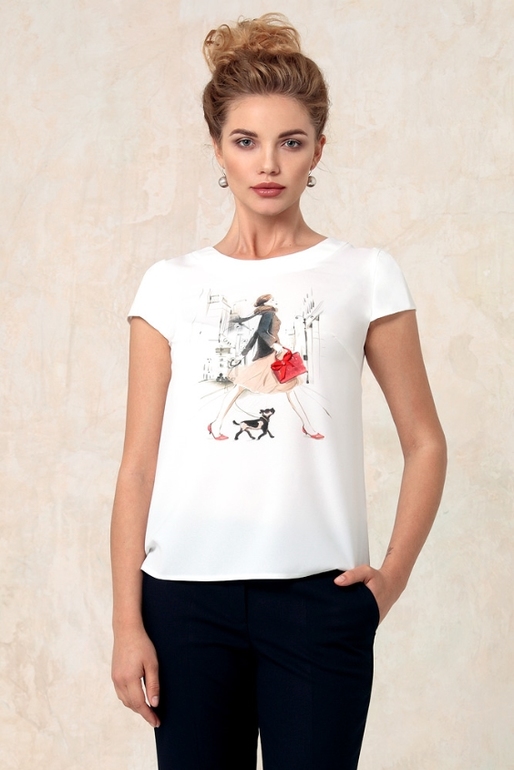 Женская блузка полуприлегающего силуэта из тонкой креповой ткани. Короткий рукав на спущенной пройме. Горловина округлая. По переду расположена крупная цифровая печать. Облегающая юбка карандаш, выполнена из костюмной ткани. Юбка на обтачке. Застёжка по среднему шву, сзади имеется шаговая шлица. Юбка на подкладке.![]()