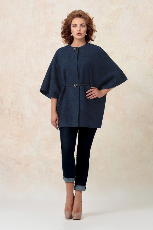 Модное полупальто выполнено из шерстяного меланжированного материал. Расширенный укороченный рукав "летучая мышь". Застёгивается по переду на одну пуговицу. Съёмный пояс подчёркивает талию. Изделие на подкладке.![]()