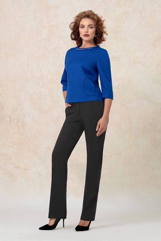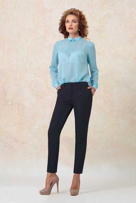 Небесно-голубая блуза из тонкого шифона,горловина оформлена низкой стойкой с маленькими округлыми отворотами , лиф украшен защипами. Маленький цветочек ручной работы-использован как элегантный декор.Классические брюки из поливискозной стрейчевой ткани. Средняя посадка, силуэт прямой, облегающие по бёдрам, слегка заужены к низу. Брюки на притачном поясе, со шлёвками для ремня. Боковые карманы.![]()