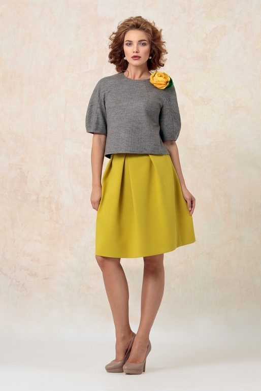 Модный свитшот укороченного силуэта из ткани неопрен. Дополнением служит дизанерский съёмный элемент. Юбка-мини прямая из поливискозной ткани![]()