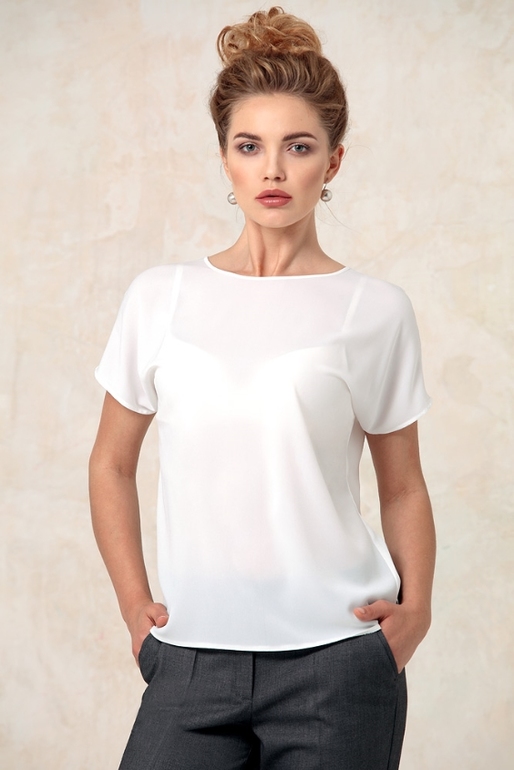 Лёгкая блузка с втачным коротким рукавом из креповой лёгкой ткани. Блузка полуприлегающего силуэта . Горловина округлая . Яркая цифровая печать придаёт особую неповторимость этой модели.