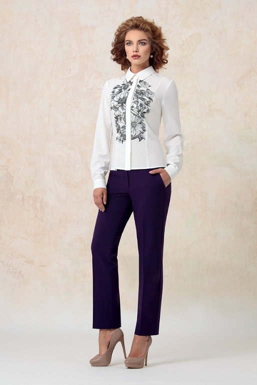 Блузка выполнена из стрейчевого хлопка. Рукав втачной, на манжете. Воротник -стойка , округлый. Застежка по переду на пуговицы. Рукав длинный с манжетой на две пуговицы. Украшением служит дизайнерская цифровая печать «роза» в романтическом стиле.Классические брюки из поливискозной стрейчевой ткани. Средняя посадка, силуэт прямой, облегающие по бёдрам, слегка заужены к низу. Брюки на притачном поясе, со шлёвками для ремня. Боковые карманы![]()