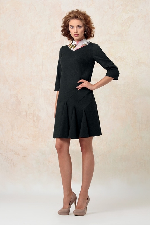 Стильное платье выполнено из поливискозной стрейчевой ткани. Прямого покроя, рукав втачной со складками, укороченный. Воротник декорирован дизайнерскими цветочками. Горловина в виде «капельки» застёгивается на пуговицу. По низу платья проходит изящная оборка, которая придаёт платью лёгкость при движении.![]()