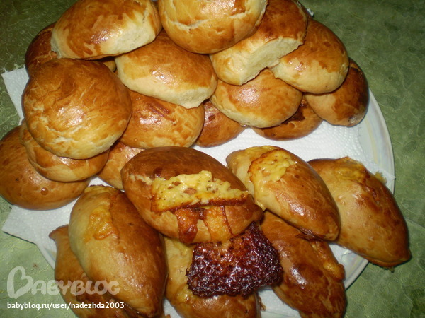 порезала кусочками и в пирожки слепила . а пышки в то же тесто меду чуток вмесила и на протьвинь ))))))) запах сумашедший и вкус потрясный , хотя и вытекла часть сыра ...