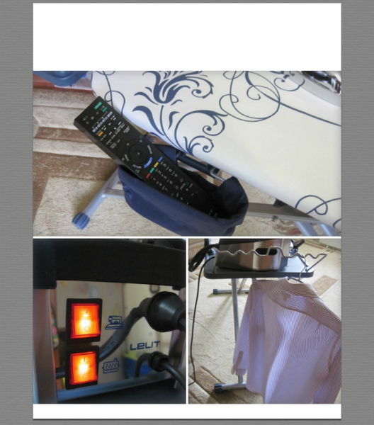 у доски есть кармашек для пульта ))) , вешалка для плечиков. У парогениратора всего две кнопки, когда он нагревается,то лампочки гаснут (одна лампа для бака, вторая для утюга)